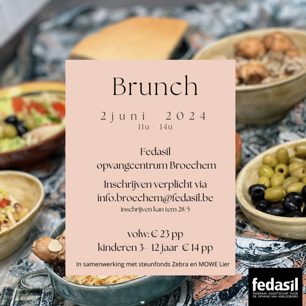 Kom op zondag 2 juni (11u) naar de Brunch in het opvangcentrum van Broechem, mede georganiseerd door Mondiale Werken! Inschrijven kan tot en met dinsdag 28 mei. Alle info: