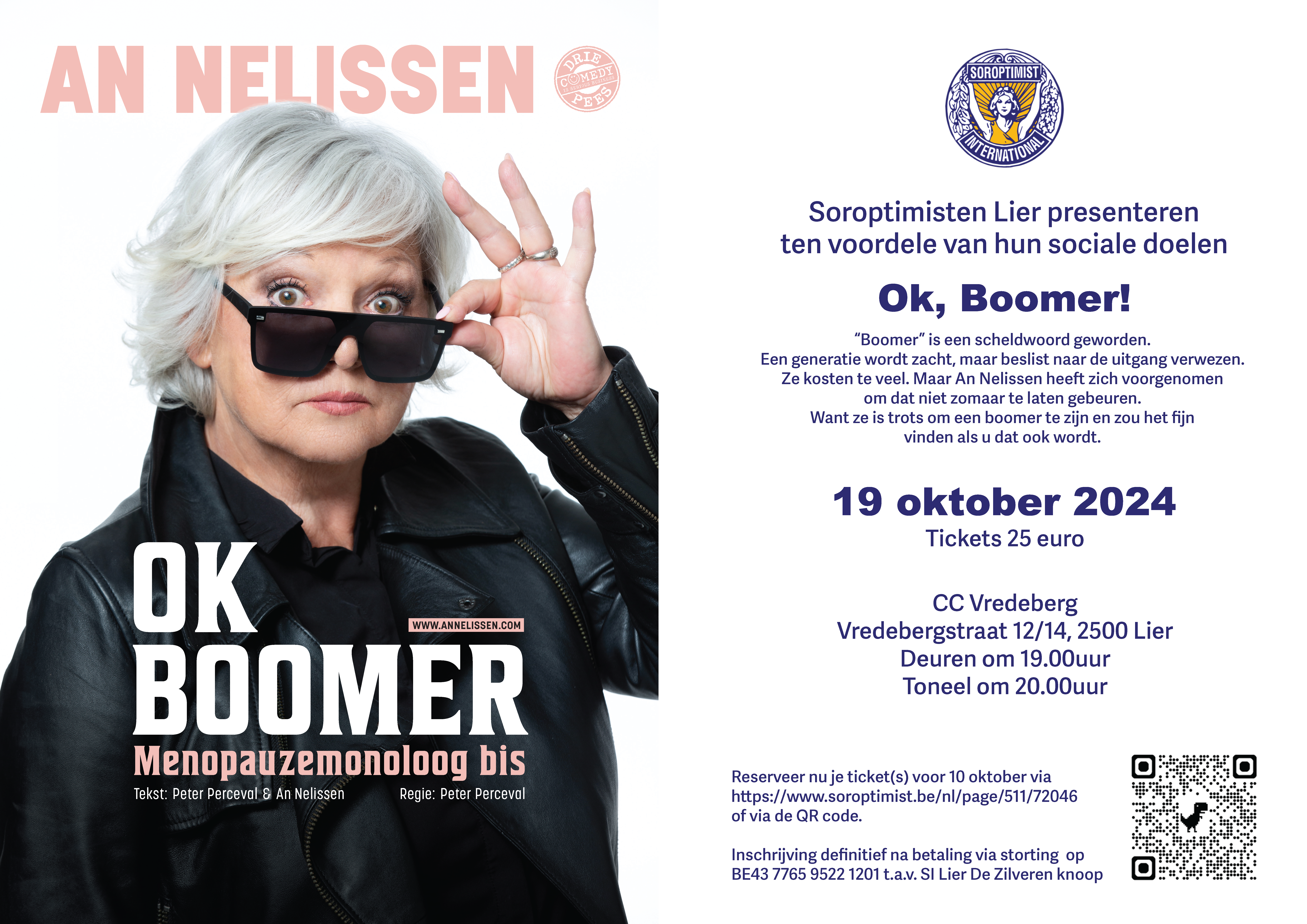 De voorstelling gaat door in de Vredeberg te Lier op 19 oktober (20u). Tickets op soroptimist.be of via de QR code op de flyer. Je inschrijving is definitief na betaling via storting op BE43 7765 9522 1201 t.a.v. SI Lier De Zilveren knoop.